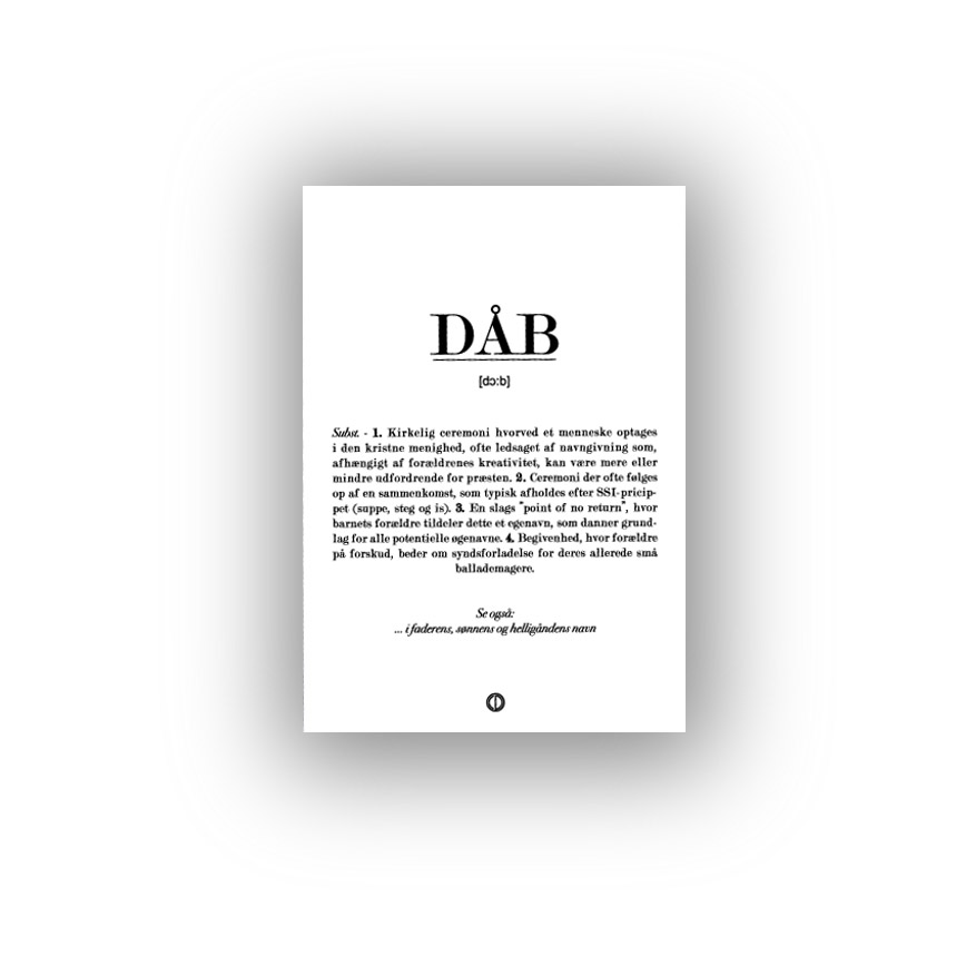 På dette kort finder du definitionen af en dåb. Kortet er oplagt at forære sammen med en gave til barnet på dåbsdagen. Kortet er i A5 format. Mål: 14,8 x 21 cm.