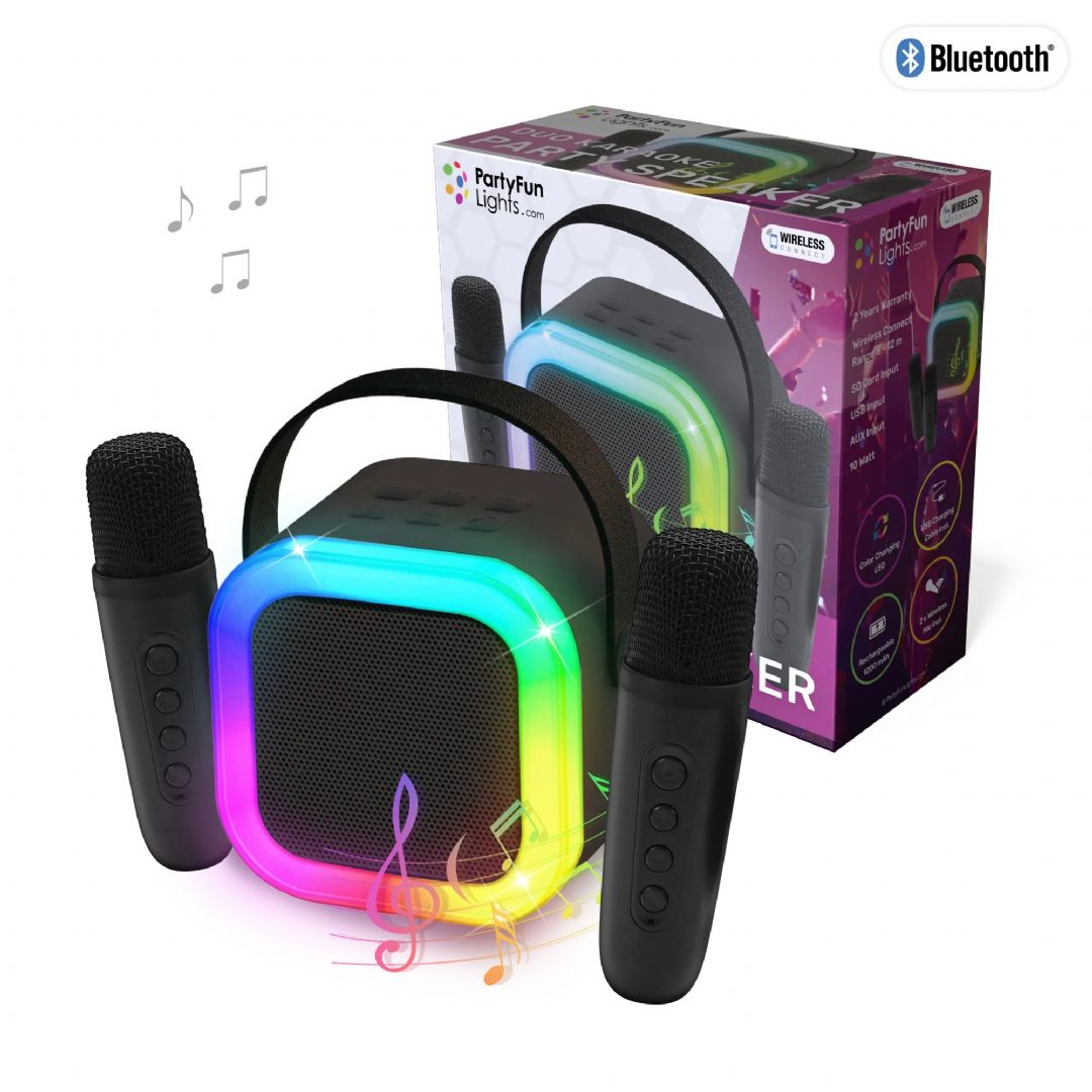 Party Funlight Duo Karaoke Party Speaker – Med 2 Mikrofoner Gør dig klar til fest. farver og fællessang Med Party Funlight Duo Karaoke Party Speaker får du alt. hvad du behøver for at skabe den ultimative karaoke-oplevelse – lige fra stuen til haven