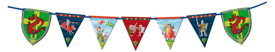 Flot festdekoration til ridder temafest . Guirlanden har 11 vimpler i hård karton og 3 meter satinbånd. Efter festen er guirlanden også rigtig fin som dekoration på børneværelset.