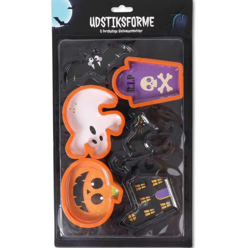 Halloween Udstiksforme 6 stk. Lav sjove og uhyggelige småkager til årets Halloween-fest med vores sæt af udstiksforme i PS plast. De klassiske Halloweenmotiver gør det let at skabe flotte kager, fondant- og marcipandekorationer, og farverne i sort og