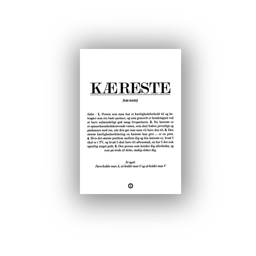 På dette kort får du definationen på en kæreste, og hvad det vil sige at være i et fast forhold. Definationen er skrevet med et glimt i øjet, og er oplagt at give til din partner på en mærkedag. Kortet er i A5 format. Mål: 14,8 x 21 cm.