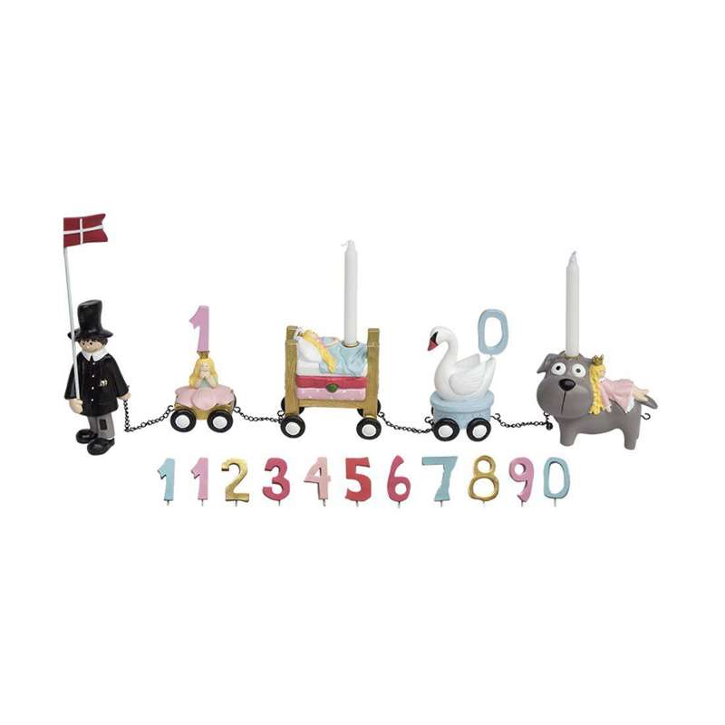 Pynt bordet fint til enhver fødselsdag med et fødselsdagstog med elementerne fra H. C. Andersen eventyr. Toget består af H. C. Andersen som går forrest med dannebrog og flager højt. Han trækker fire flotte togvogne, hver vogn har et tema fra et eventyr.