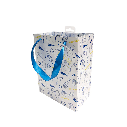 Gavepose til student, eller til fest i hvid pose med motiver i blå farve. Blå bånd til at bære den i, og med et lille kort på siden til at skrive en lille hilsen på. Produktinfo Navn: Gavepose til student fest. Producent: Joker. Størrelse: 17,5 c
