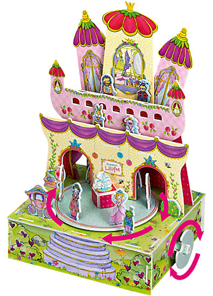 Super fint Prinsesse Lillefe Slotsbal. På siden er der et lille hjul, som man kan dreje på og på den måde få Lillefe og hendes venner til at danse forbi. Slottet kan samles uden brug af lim og saks. Slottet fungerer fint som centerpiecebordpynt. Mål: 21