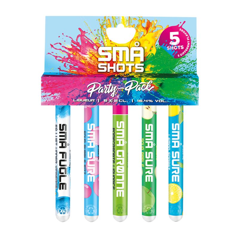 Perfekte shotsrør til fest og farverGør festen lidt sjovere med Små Shots Shotsrør Party Pack Mix, en farverig og smagfuld pakke med 5 x 2 cl shots i smarte plast-rør. Denne pakke byder på forskellige, velkendte Små Shots-varianter, der både ser godt ud o
